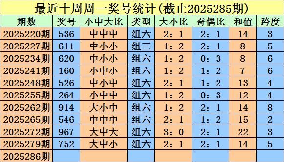 奖号类型判断:近期周一组六明显活跃,近十周开出9次,上周一为组六,组三出现较少,本周一看好在组六。