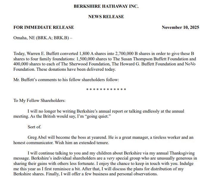 这或将是“股神”作为伯克希尔首席执行官(CEO)的最后一份声明。