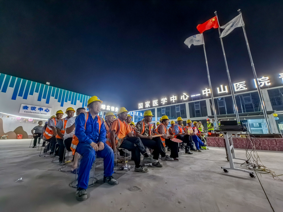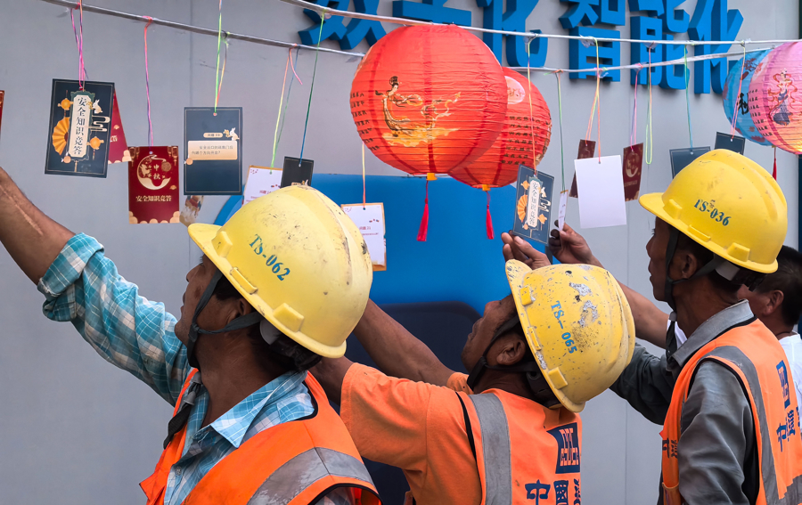 10月4日,盏盏花灯点亮,中建二局中山医院国家医学中心建设项目的工友们抱着刚刚游戏赢得的奖品,在该建设工地欣赏着《我和我的祖国》。在国庆、中秋双节期间,坚守一线的工人共享一场特别的“团圆”。