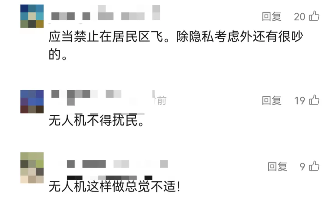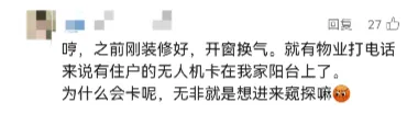刚入住该小区的陈先生也表示,晚上11点,自己在家中和朋友聊天时,突然发现有一台无人机在离自己房间10米的地方上下垂直飞行,还曾停留在他家的窗前,“就算是航拍,为什么非要这个点?”